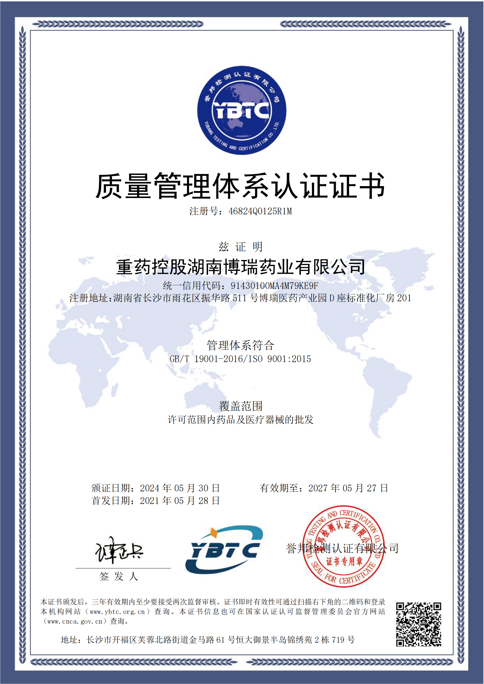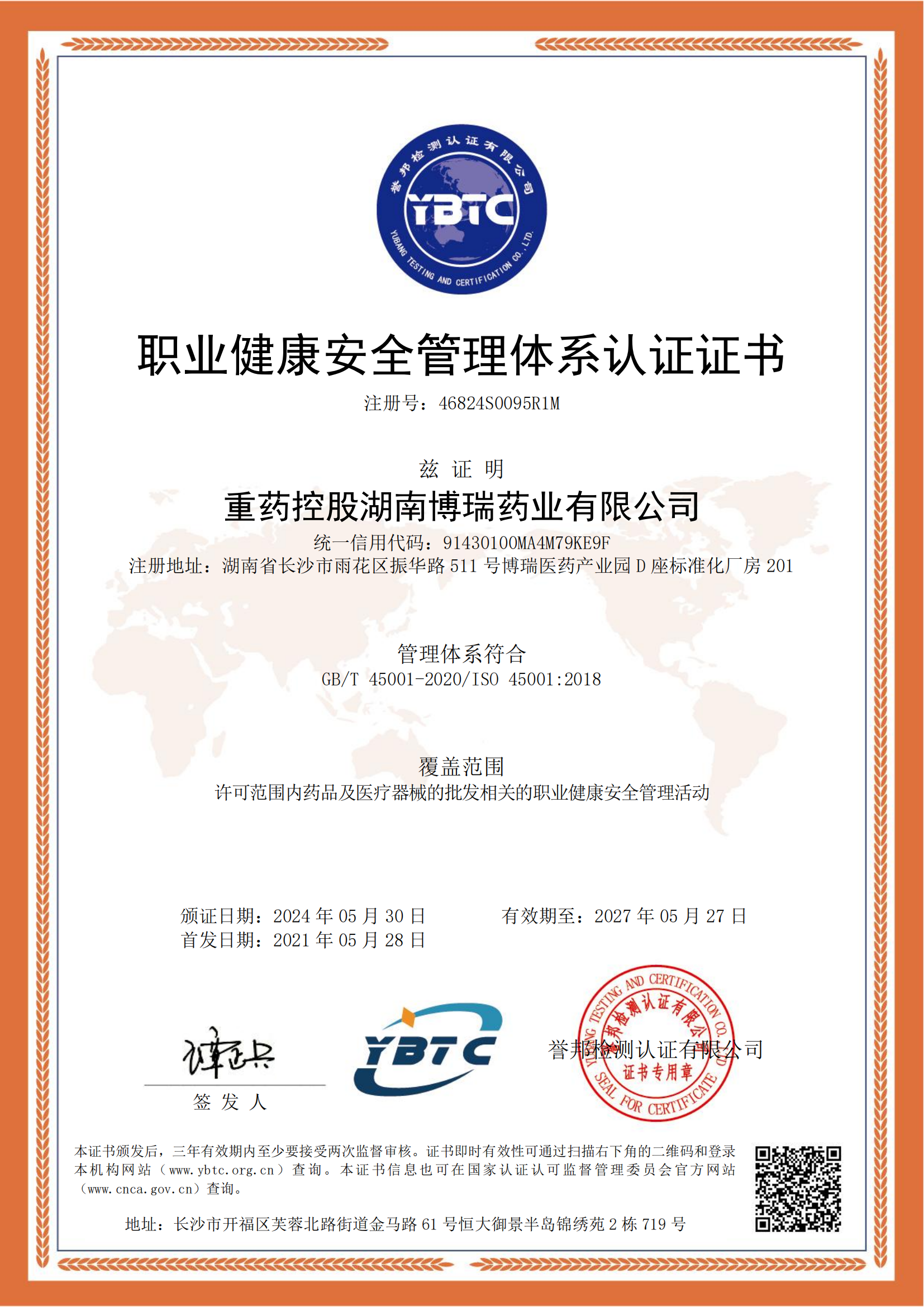 同時,重藥控股湖南博瑞藥業(yè)還通過了GB/T 45001-2020/ISO 45001:2018職業(yè)健康安全管理體系認證、GB/T 24001-2016/ISO 14001:2015環(huán)境安全管理體系認證,GB/T 19001-2016/ISO 9001:2015質(zhì)量管理體系認證,這標志著我司在質(zhì)量管理、職業(yè)健康及環(huán)境管理方面的卓越表現(xiàn)再次獲得國際認可。